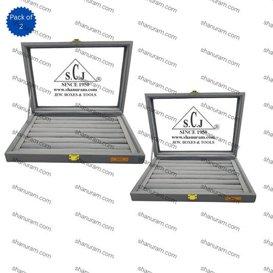 Pack of 2 Black Suede Ring Stock Display Box with Glass Lid | 7 Shelves Jewellery Box