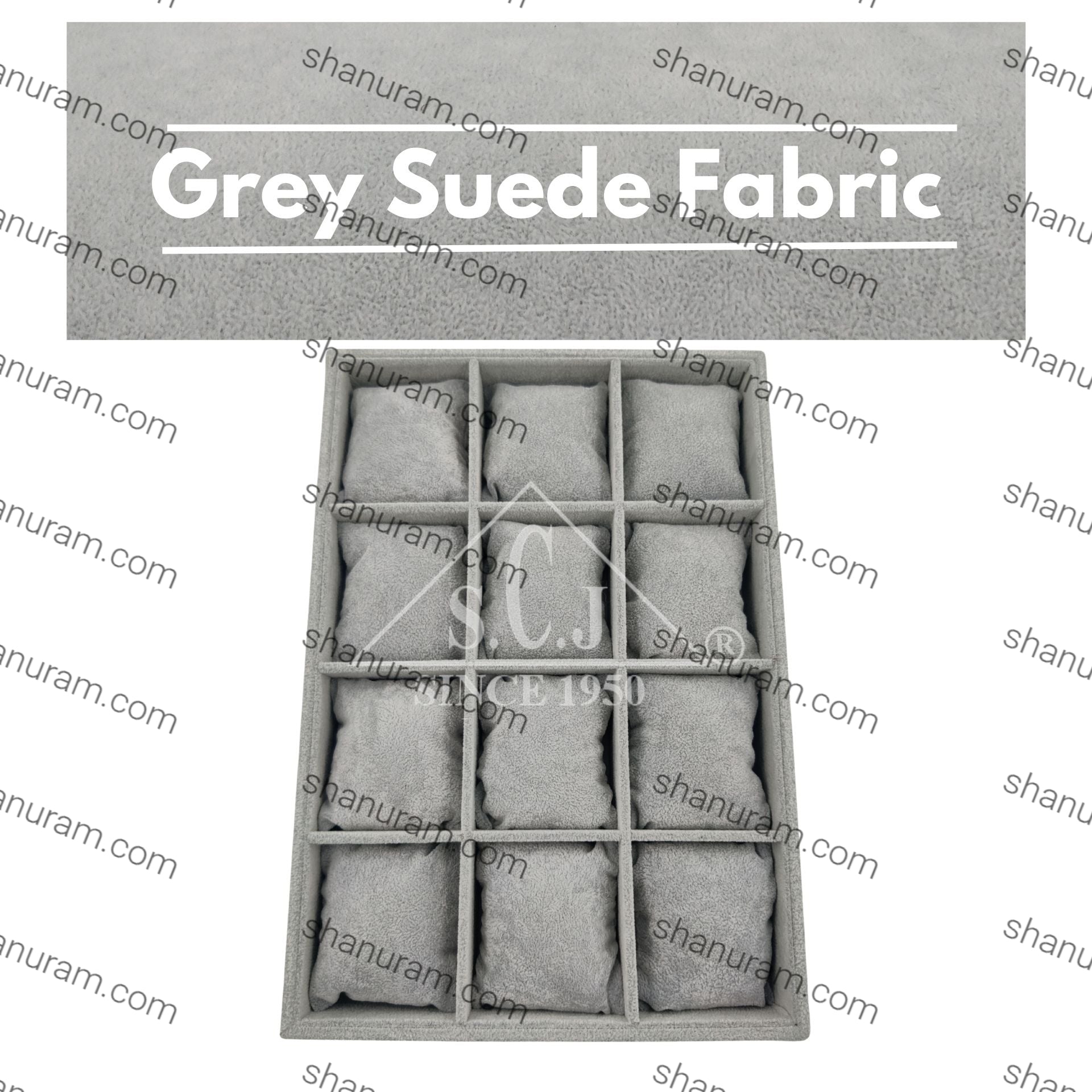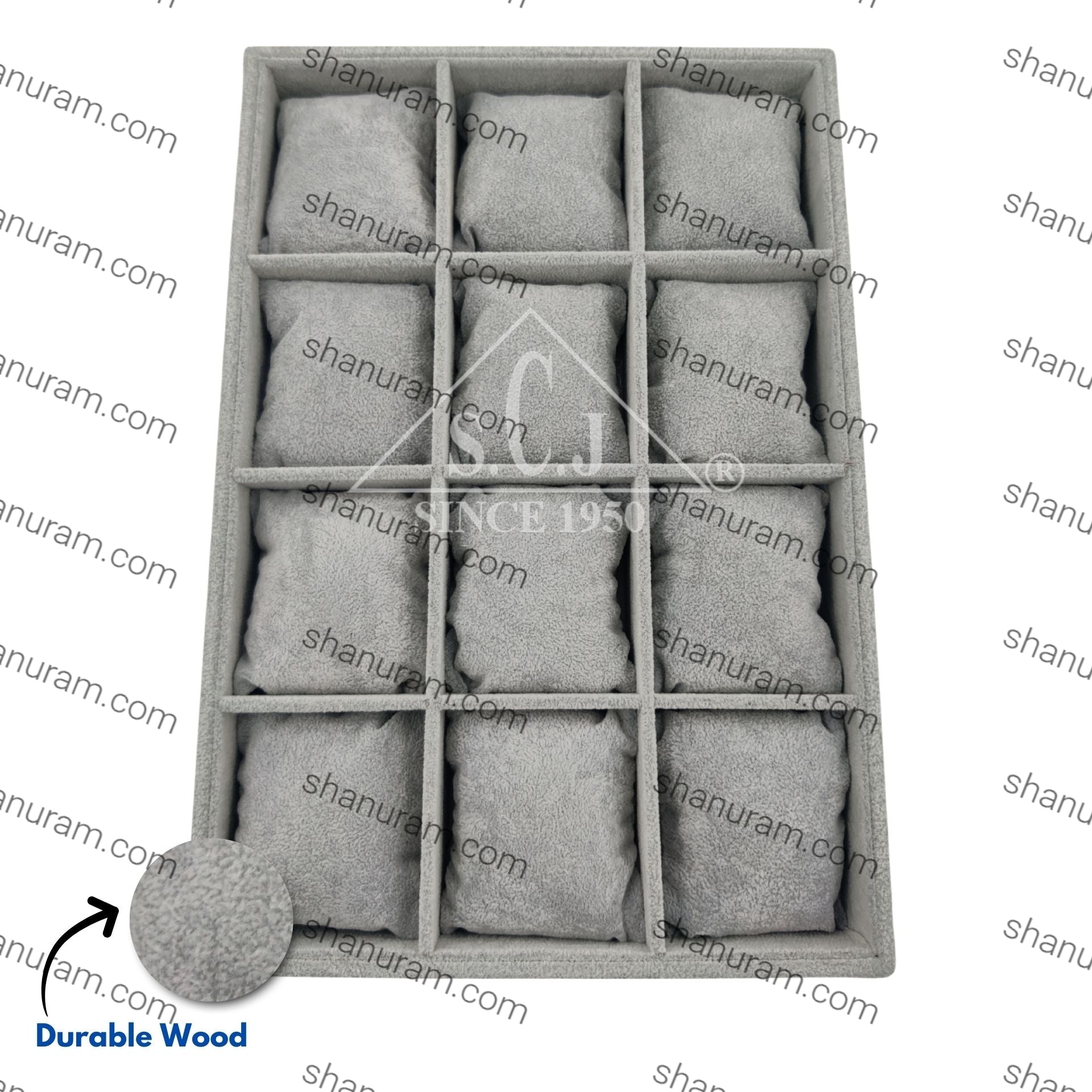 This 12-grid bracelet jewelry stock display tray is a perfect blend of style and organization. Crafted from durable wood and wrapped in soft suede, it offers a luxurious touch while protecting your bracelets. The tray features a mirror display for convenient viewing, and the 12 compartments ensure each bracelet is beautifully displayed and easily accessible. Ideal for personal use or retail settings, this tray combines elegance with practicality. | Size : 14" x 9.5" x 2" | Material : Durable Wood | Shape : Rectangle | Color : Grey