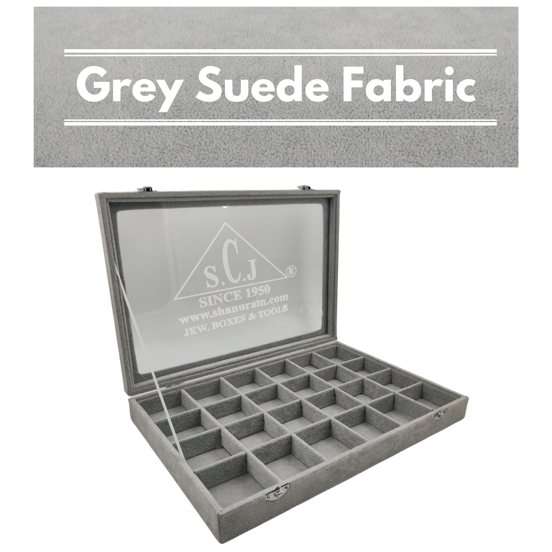 This 24-grid jewelry storage box, covered in elegant grey suede cloth, features a mirrored display for added sophistication. It includes removable dividers, allowing for customizable organization of earrings and other jewelry, ensuring both versatility and style. | Size : 14" x 9.5" x 2" | Material : Durable Wood | Shape : Rectangle | Color : Grey