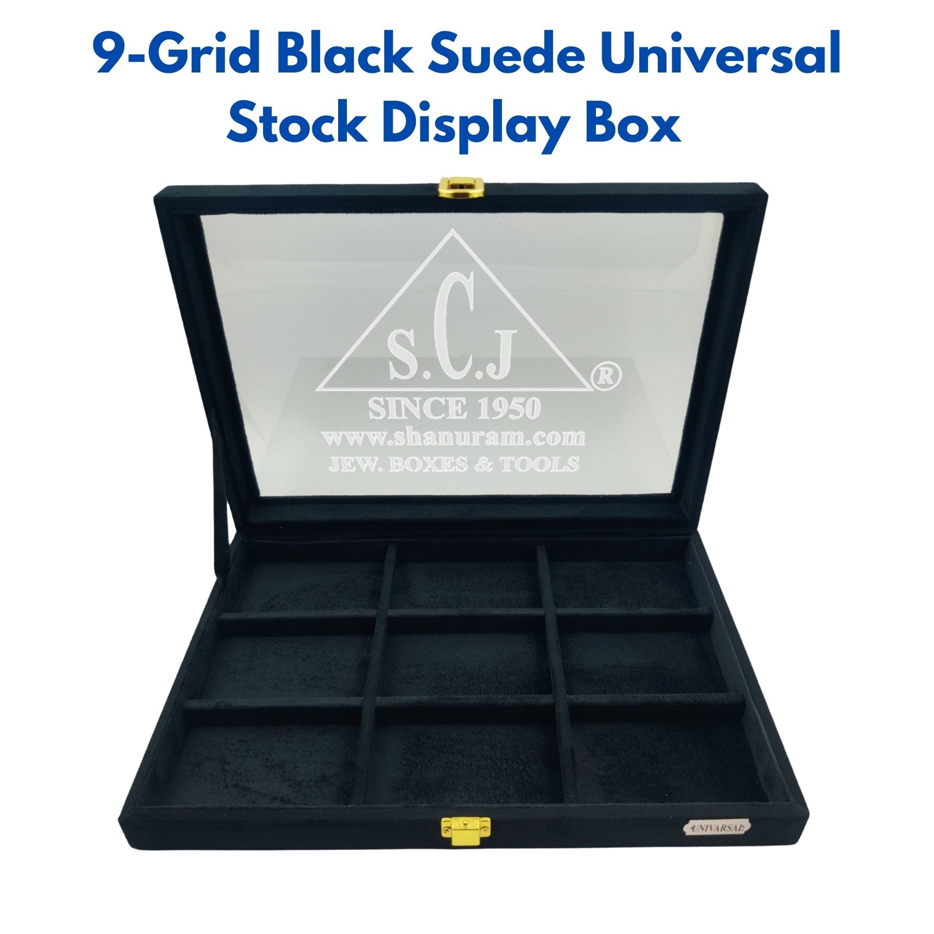 This 9-grid universal stock box is designed with a sleek black suede exterior and interior, offering a uniform and sophisticated look. The box features nine compartments, ideal for organizing various small items or jewelry. A glass display on the top adds elegance while providing a clear view of the contents. Perfect for both storage and presentation, this box combines practicality with refined style. | Size : 13" x 9" x 2" | Inner Material : Black Suede Fabric | Outer Material : Black Suede Fabric