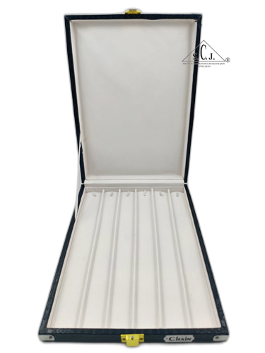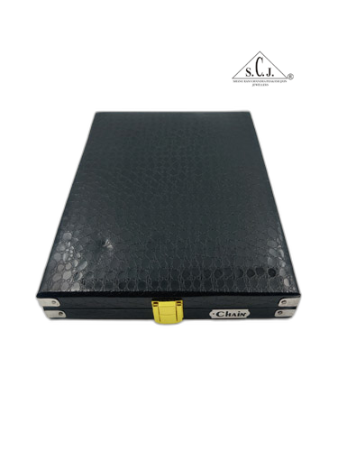 This chain stock box features a bold black crocodile texture on the exterior, providing a luxurious and textured appearance. The interior is lined with imported white PU cloth, offering a sleek and elegant backdrop for your chains. Ideal for both storage and display, this box combines distinctive style with practical functionality. | Size : 11" x 8" x 1.5" | Inner Material : Imported Pu White Cloth | Outer Material : Black Crocodile Texture