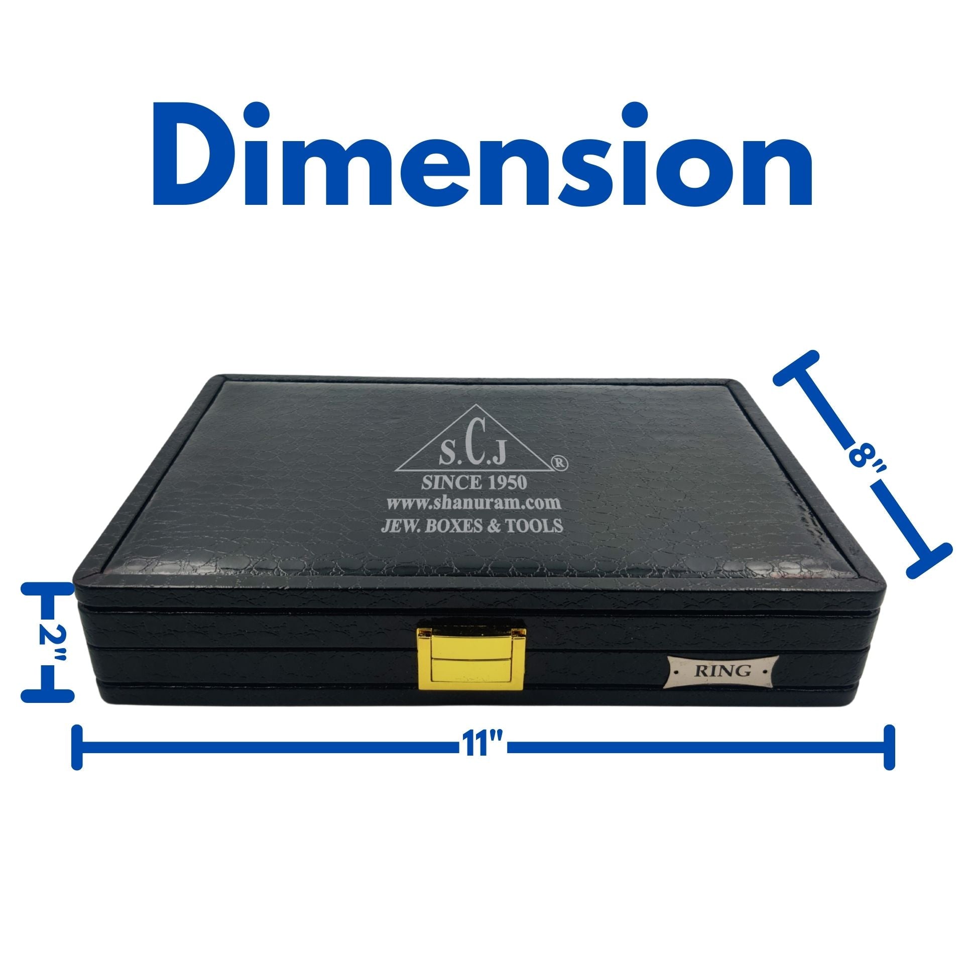 This ring stock box boasts a refined exterior with a striking black crocodile texture, giving off an air of boldness and luxury. The interior is lined with imported cream PU cloth, creating a delicate and sophisticated space for your rings. Perfect for storage and display, this box seamlessly marries unique style with practical elegance. | Size : 11" x 8" x 2" | Inner Material : Imported Pu Cream Cloth | Outer Material : Black Crocodile Texture