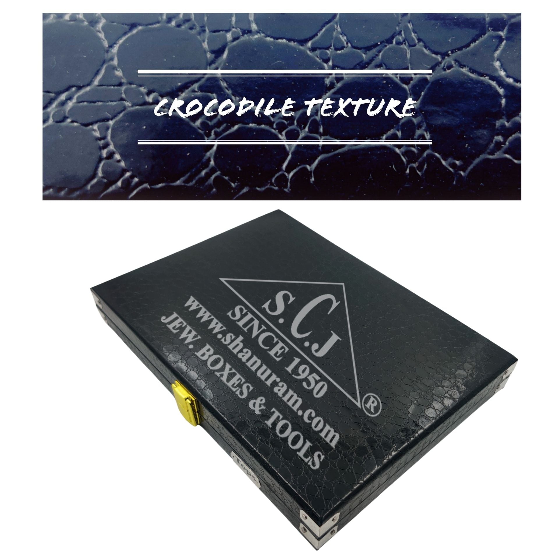 This tops stock box boasts a sleek black crocodile texture exterior, giving it a sophisticated and textured appearance. The interior is lined with imported white PU cloth, offering a refined and contrasting background for your jewelry. This versatile box serves both as a storage solution and a display, seamlessly blending elegant style with practical functionality. | Dimensions: 11" x 8" x 1.5" | Inner Material: Imported PU White Cloth | Outer Material: Black Crocodile Texture