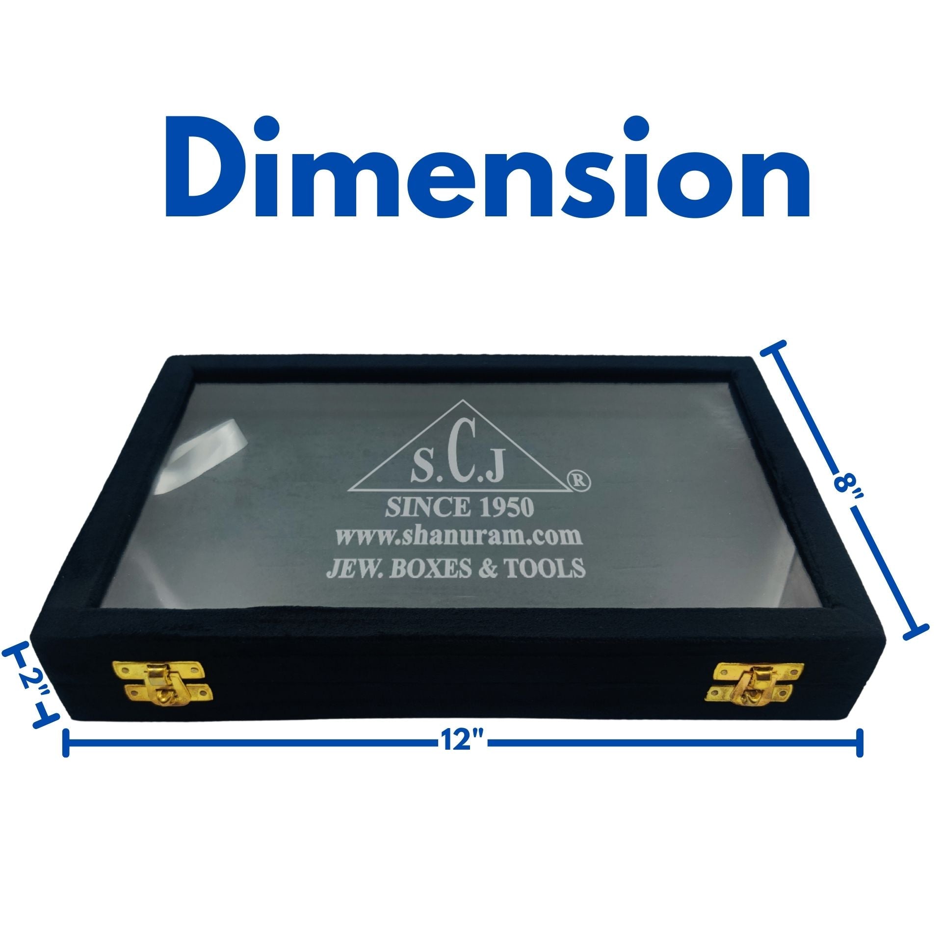 Expertly crafted from smooth black suede fabric, this ring storage box boasts a sleek and uniform design. The sophisticated glass display on top adds a touch of elegance while allowing for a clear view of your rings. With a size of 12" x 8" x 2" and an interior and exterior made of black suede fabric, this box offers both practical functionality and stylish presentation for your beloved rings.