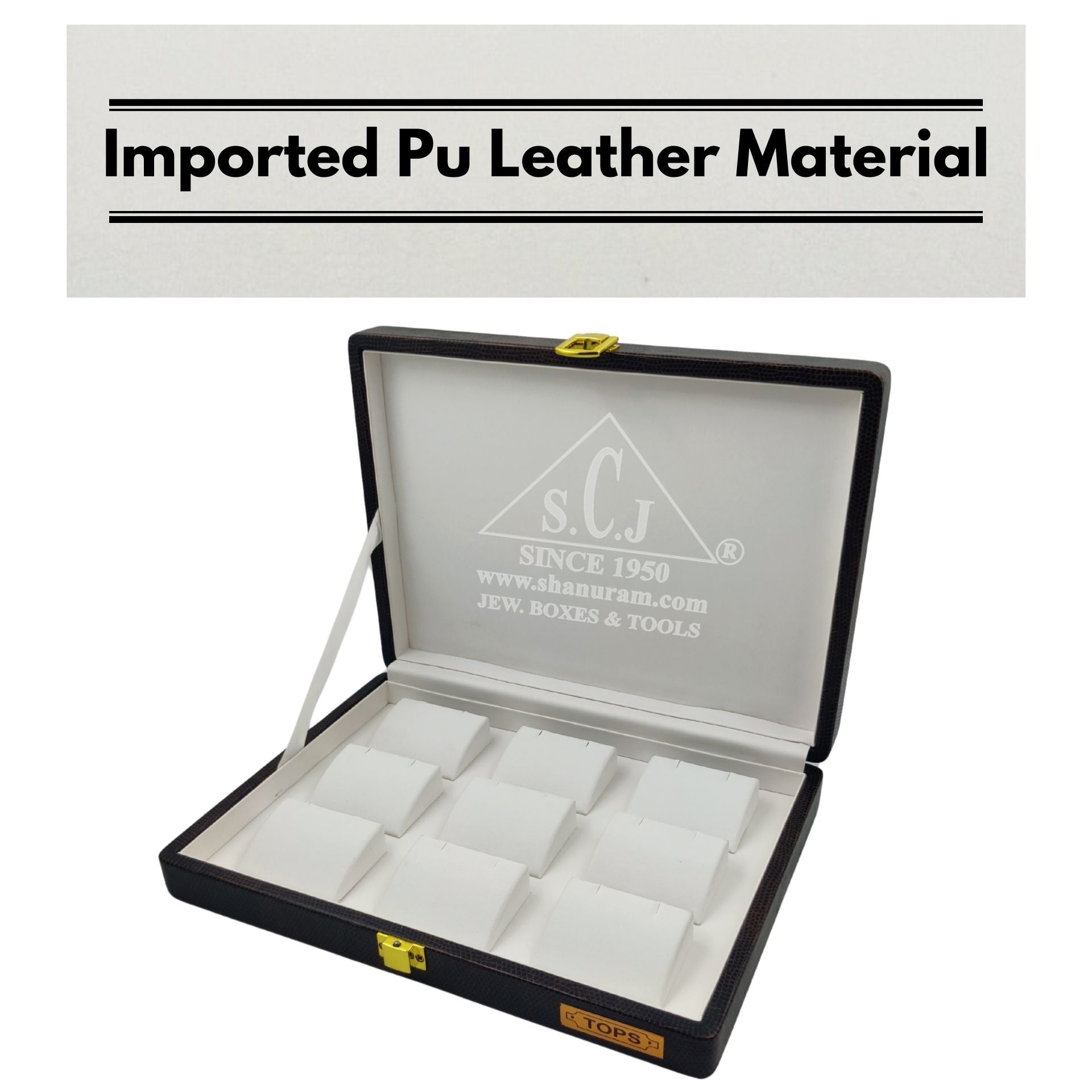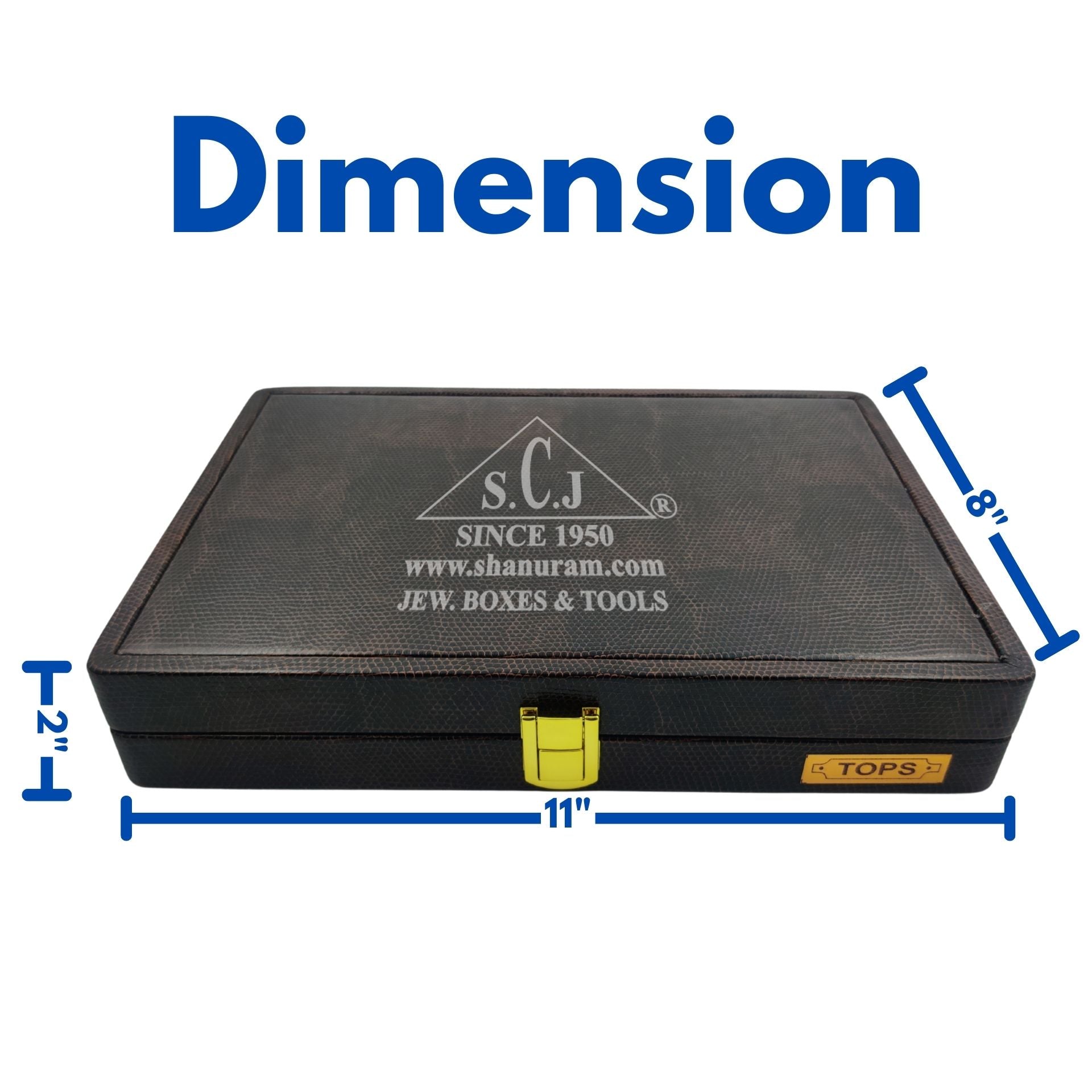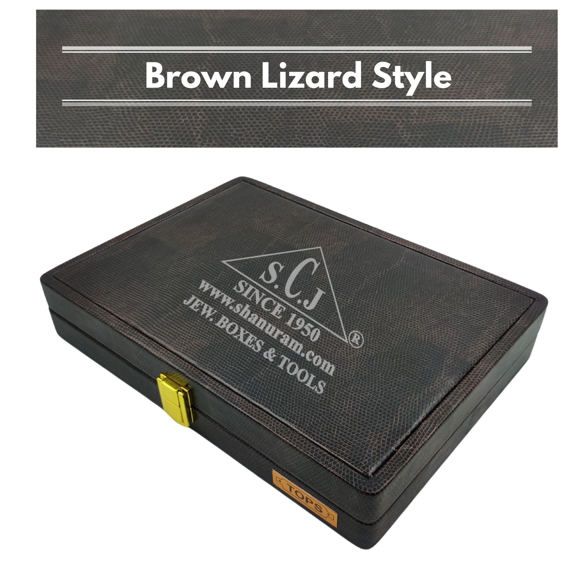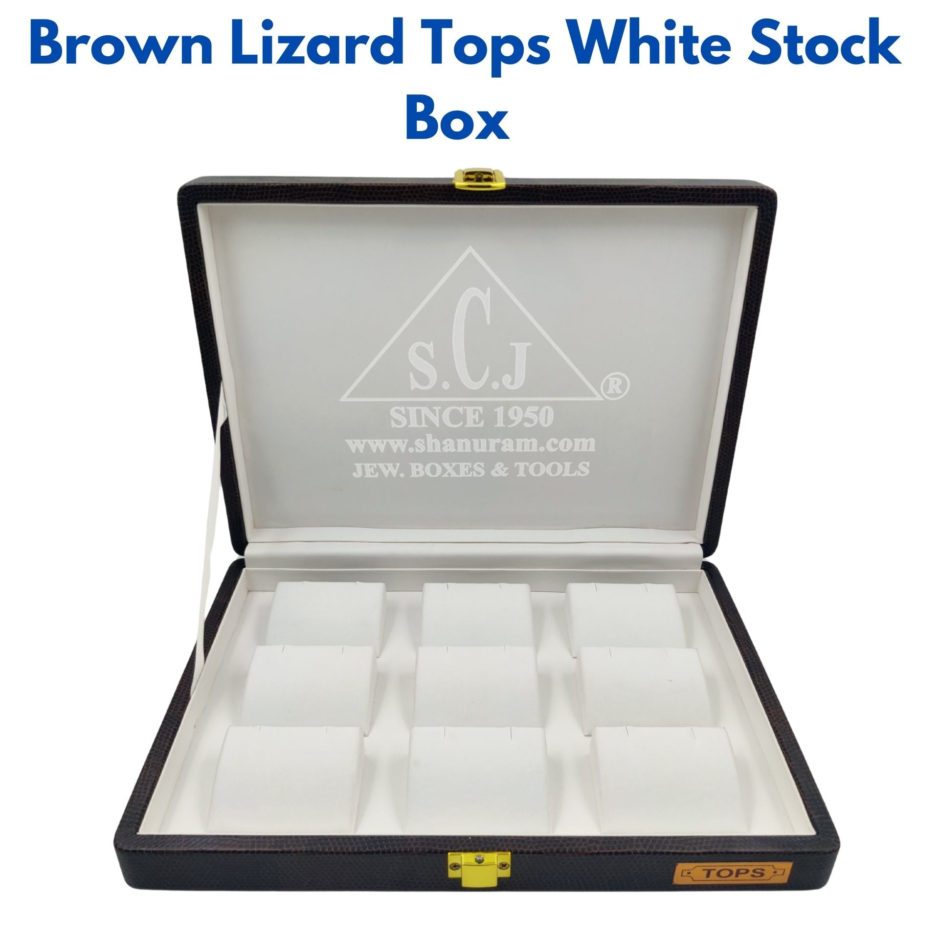 This stock box for tops boasts a stunning exterior with a distinct brown lizard design, lending a sophisticated touch. Its interior is lined with imported white PU cloth, creating a sleek and refined background for your jewelry. With its size measuring 11" x 8" x 2" and the inner material being imported Pu white cloth, this box is perfect for storing and displaying your pieces while seamlessly blending style and practicality.