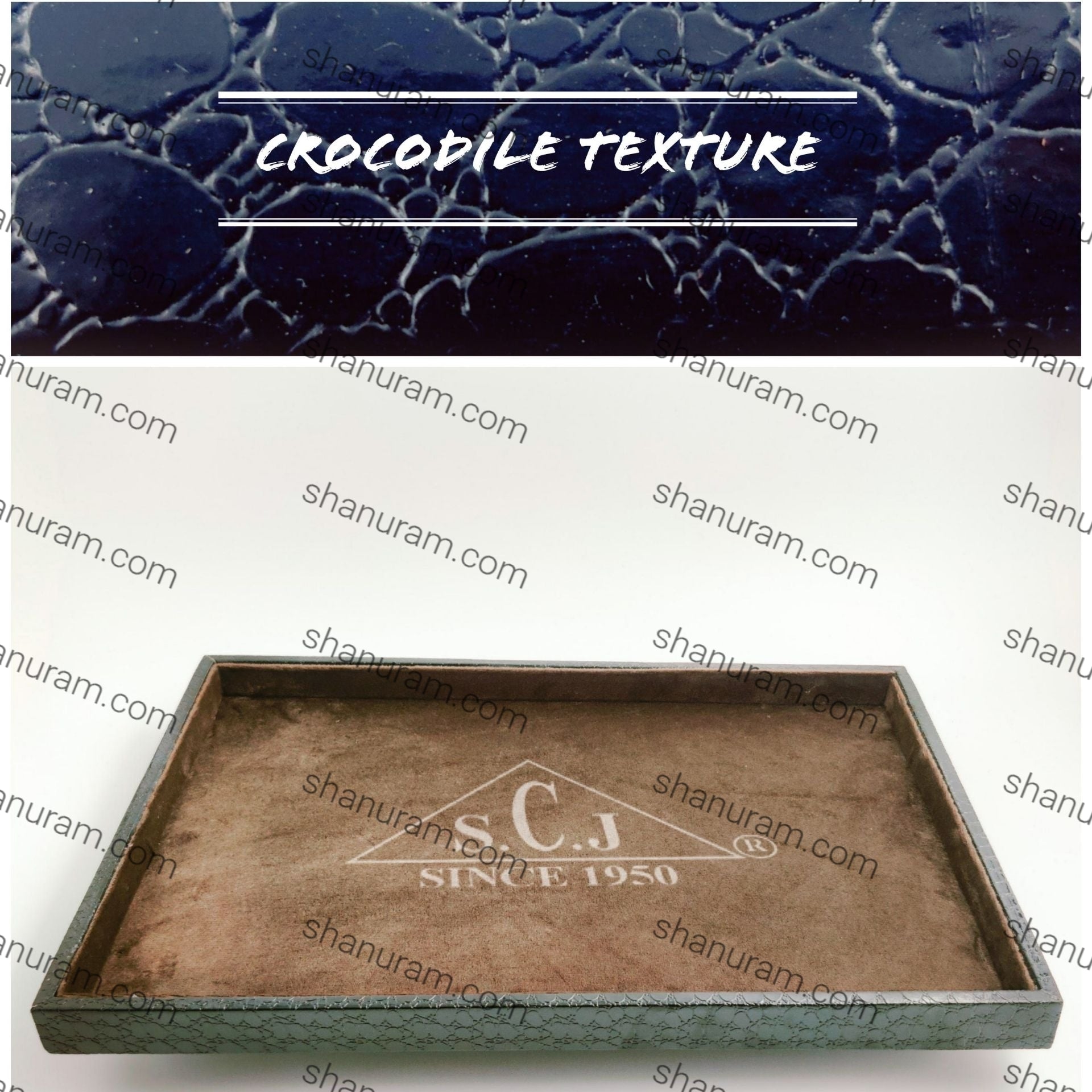 * We Can Put Logo Of Your Brand On Outer Wall Or We Can accommodate it Inside The Trays as Desired | Size : 14" x 10" x 1" | Inner Part : Brown Suede | Outer Boundary : Crocodile Texture | Material : Durable Wood