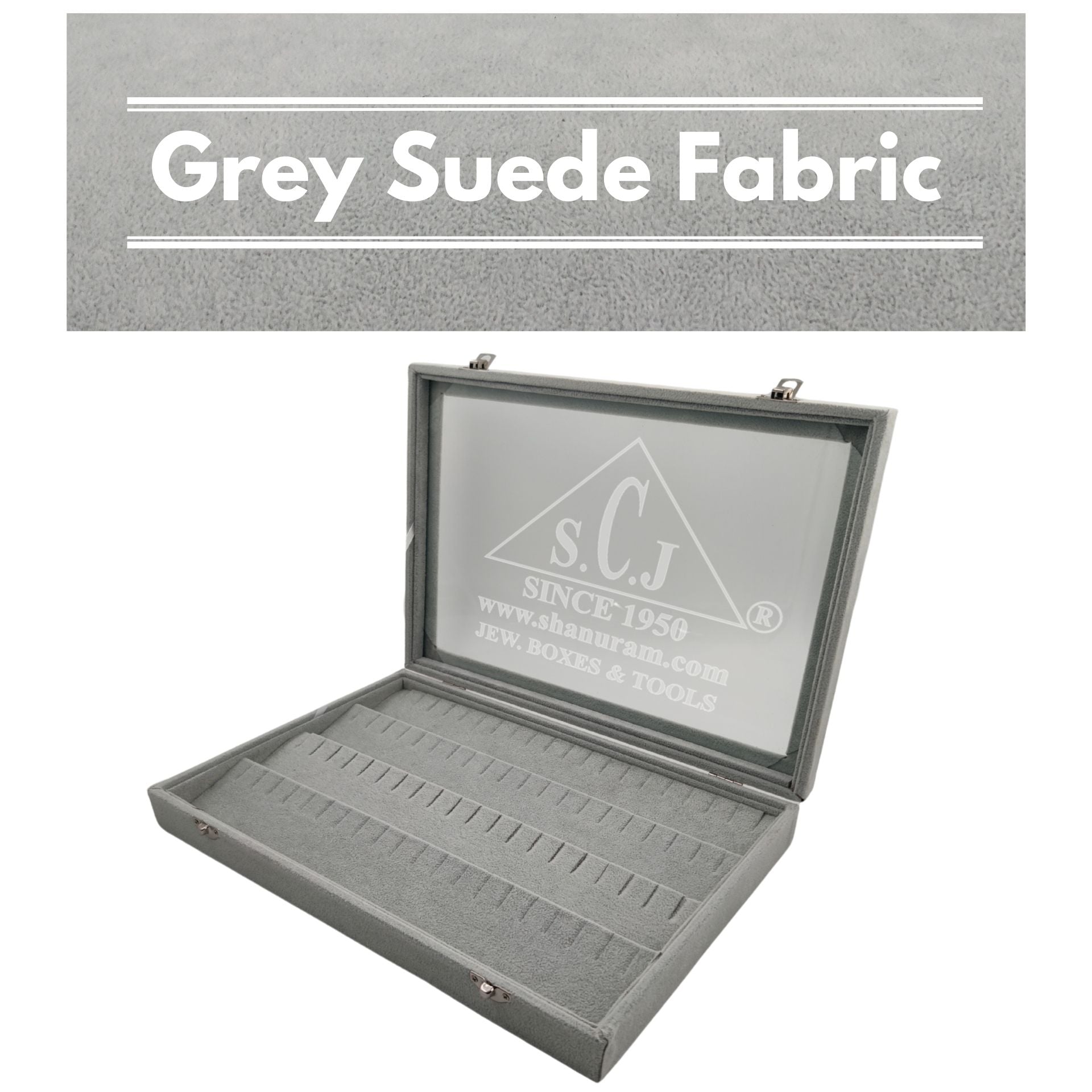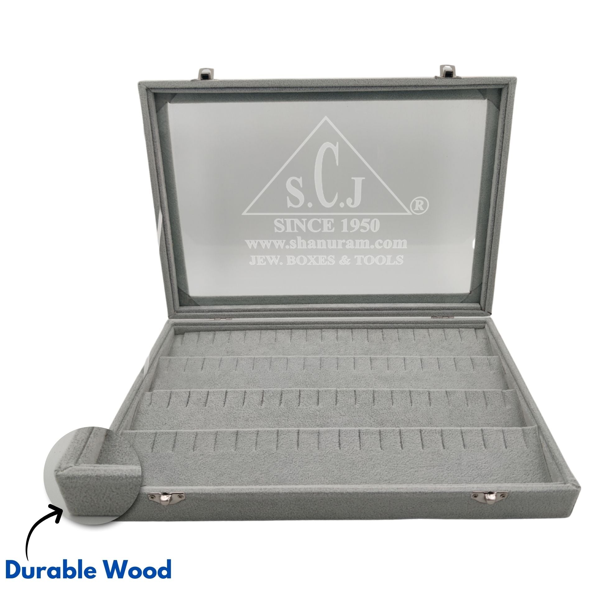 This elegant earring jewelry stock box is crafted from high-quality wood, offering durability and a timeless look. The exterior is covered with soft suede, adding a luxurious touch to its design. Inside, the box features a mirror display, making it easy to view and select your earrings. Perfect for both personal use and retail display, this jewelry box combines functionality with style. | Size : 14" x 9.5" x 2" | Material : Durable Wood | Shape : Rectangle | Color : Grey
