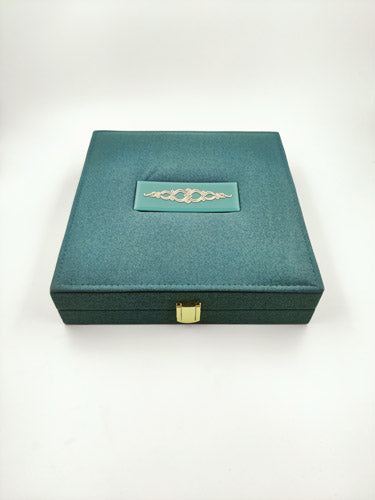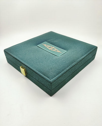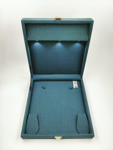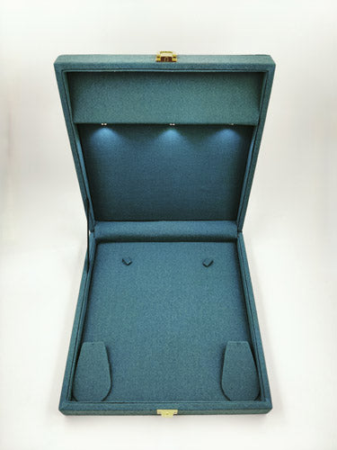 This sophisticated large necklace set box, crafted from high-quality micro fiber, is perfect for Indian jewelry. The luxurious dark green exterior is complemented by an interior LED light, which beautifully illuminates the large necklace set, highlighting its intricate details. Ideal for presenting your jewelry with elegance and style.