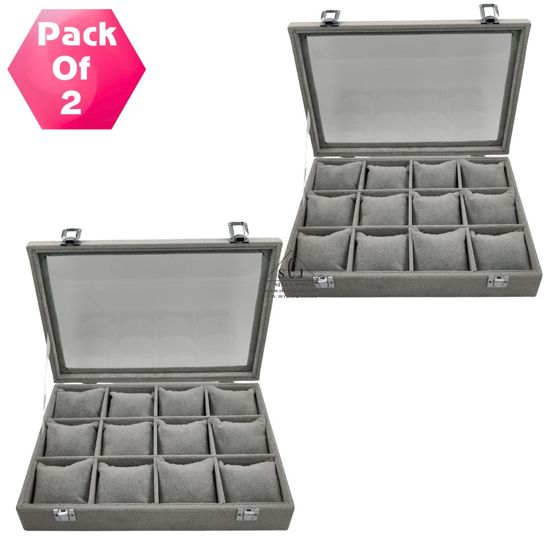 Pack of 2 – 12-Grid Bracelet Display Boxes | Grey Suede Jewellery Organizer with Cushions & Transparent Lid | Premium Stock Box for Retail & Personal Use