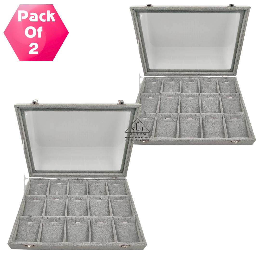 Pack of 2 – 15-Grid Earring & Pendant Jewellery Display Boxes | Transparent Lid | Grey Suede Finish | Jewellery Organizer for Retail & Personal Use