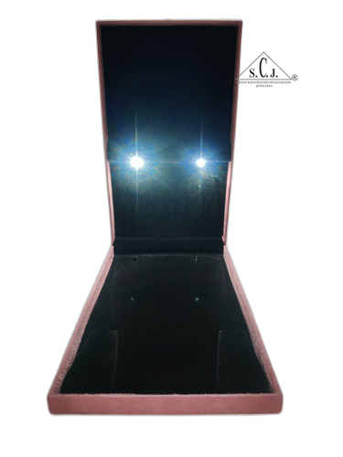 This Cuthley Texture suede fabric long necklace set box in chic pink is crafted to elegantly display your jewelry. The exterior features a refined Cuthley texture, while the interior is lined with luxurious black velvet to securely cradle your long necklace set. An LED light highlights the necklace's beauty, adding a premium touch to the presentation. Ideal for showcasing your long necklace set with sophistication and style. | Size : 8.75" x 15" x 2" | Inner Material : Black Velvet | Outer Material : Cuthley Texture Suede Fabric | Color : Pink