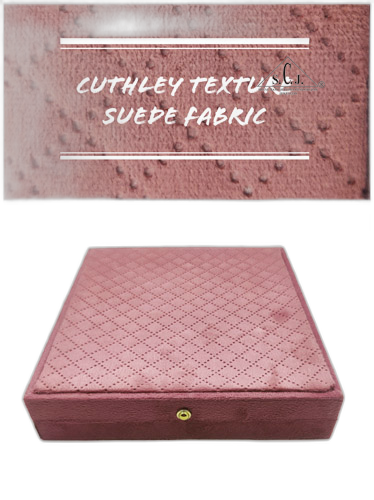 This Cuthley Texture suede fabric medium necklace set box in elegant pink offers a refined presentation for your jewelry. The exterior features a luxurious Cuthley texture, while the interior is lined with soft black velvet to cradle and highlight your necklace set. An LED light adds a premium touch, illuminating the necklace set and enhancing its brilliance. Ideal for showcasing your jewelry with sophistication. | Size : 8" x 8.5" x 1.75" | Inner Material : Black Velvet | Outer Material : Cuthley Texture Suede Fabric | Color : Pink