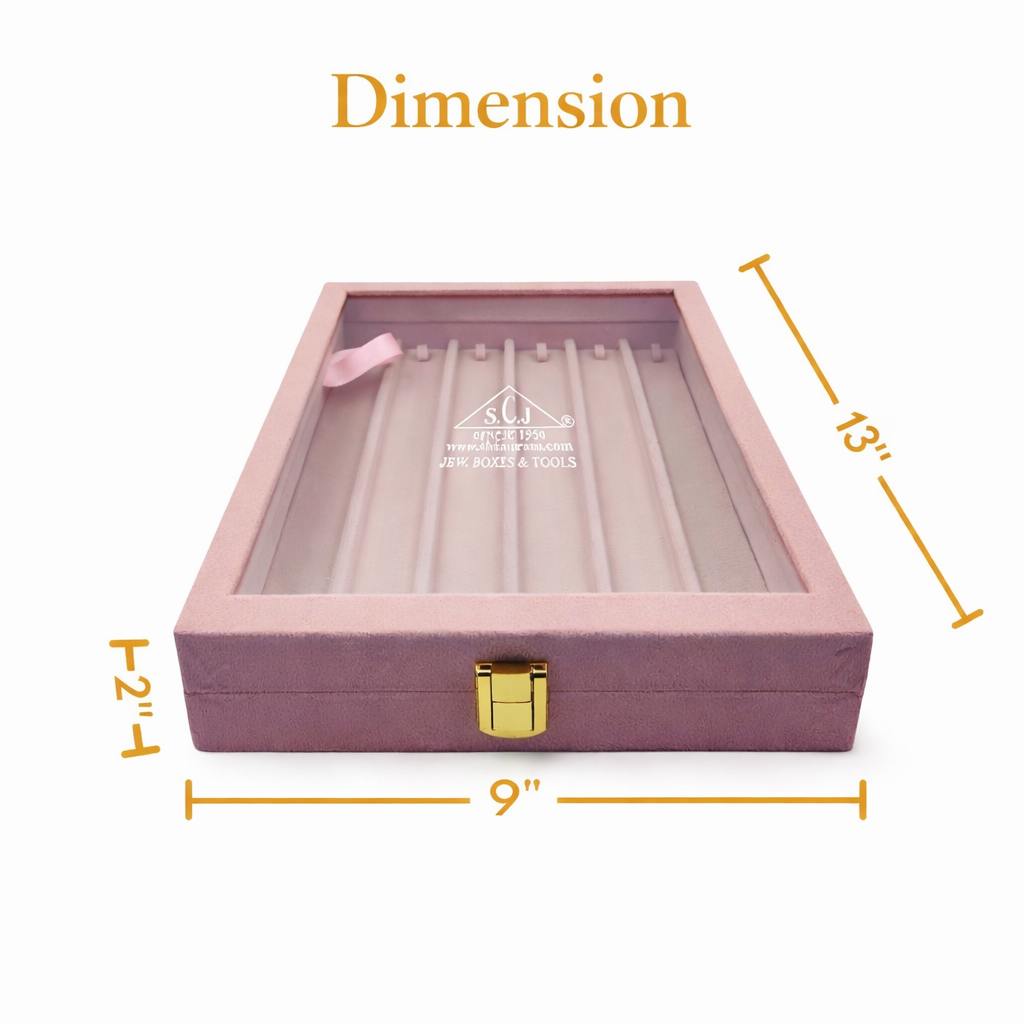 Each box is crafted with a durable wooden body and finished in soft pink suede fabric, giving a premium and attractive appearance. The transparent glass top lid allows clear visibility of pendants while protecting them from dust.