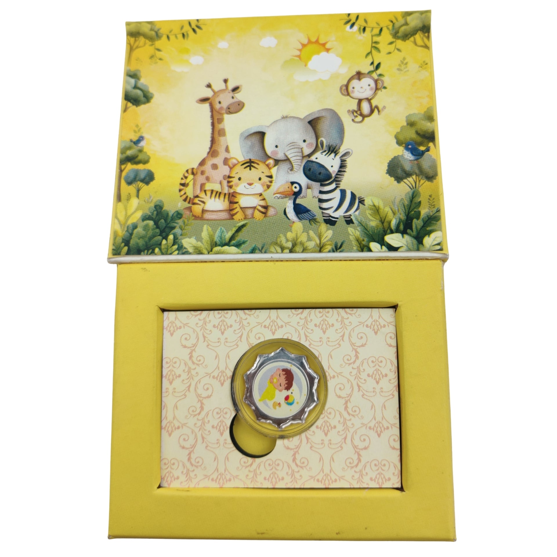 The cheerful yellow box with cute animal illustrations adds charm, while the secure inner holder keeps the silver coin safe and protected.