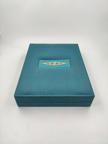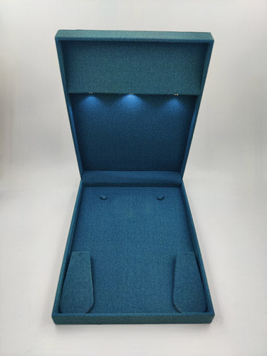 This exquisite Rani necklace (haar) set box, crafted from premium micro fiber, is designed for Indian jewelry. The dark green exterior exudes royal elegance, while the interior LED light beautifully illuminates the Rani necklace set, enhancing its majestic allure. Perfect for presenting your jewelry with timeless sophistication.