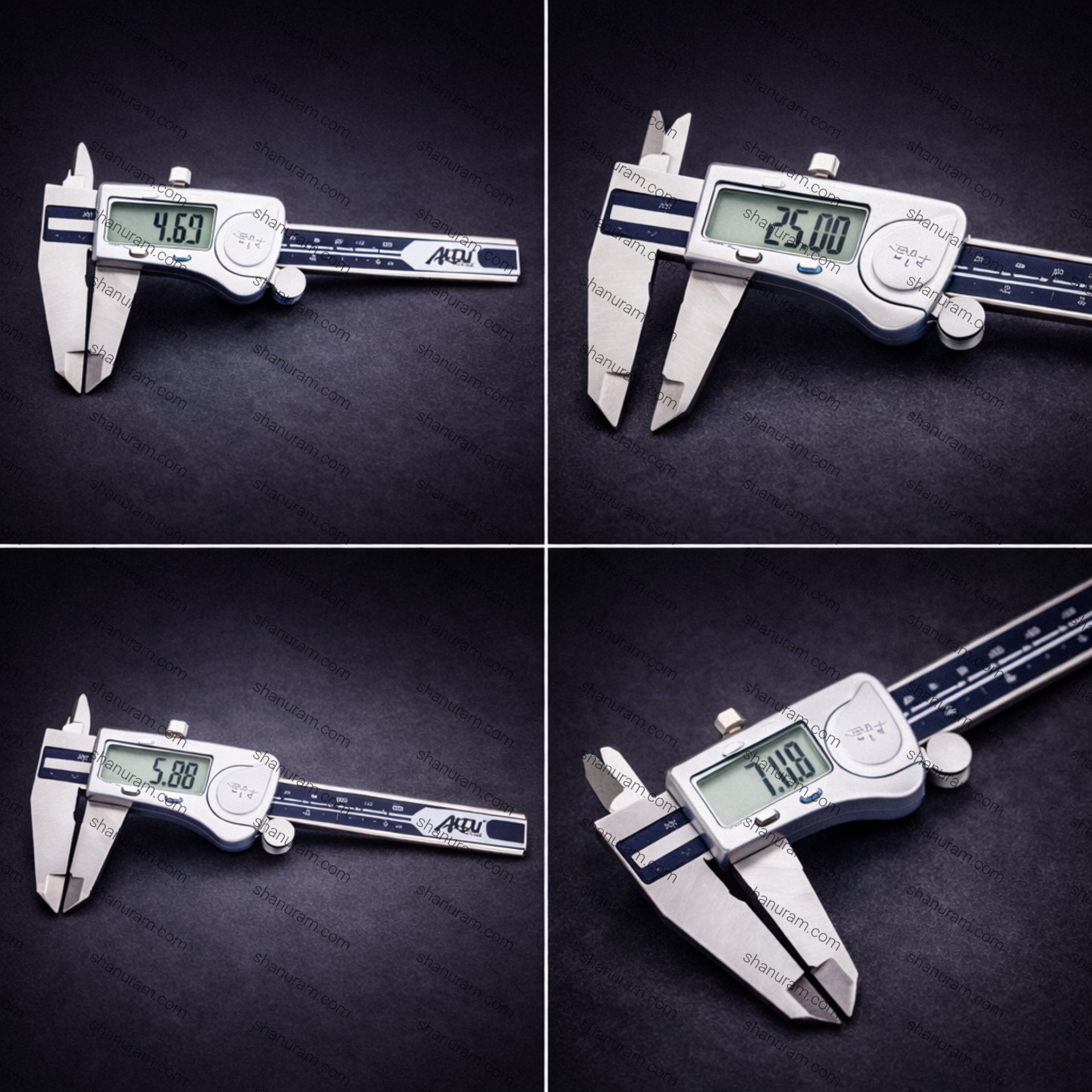 This digital caliper can be used to measure inside and outside diameter, depth and step with two sets of Jaws and a Probe.