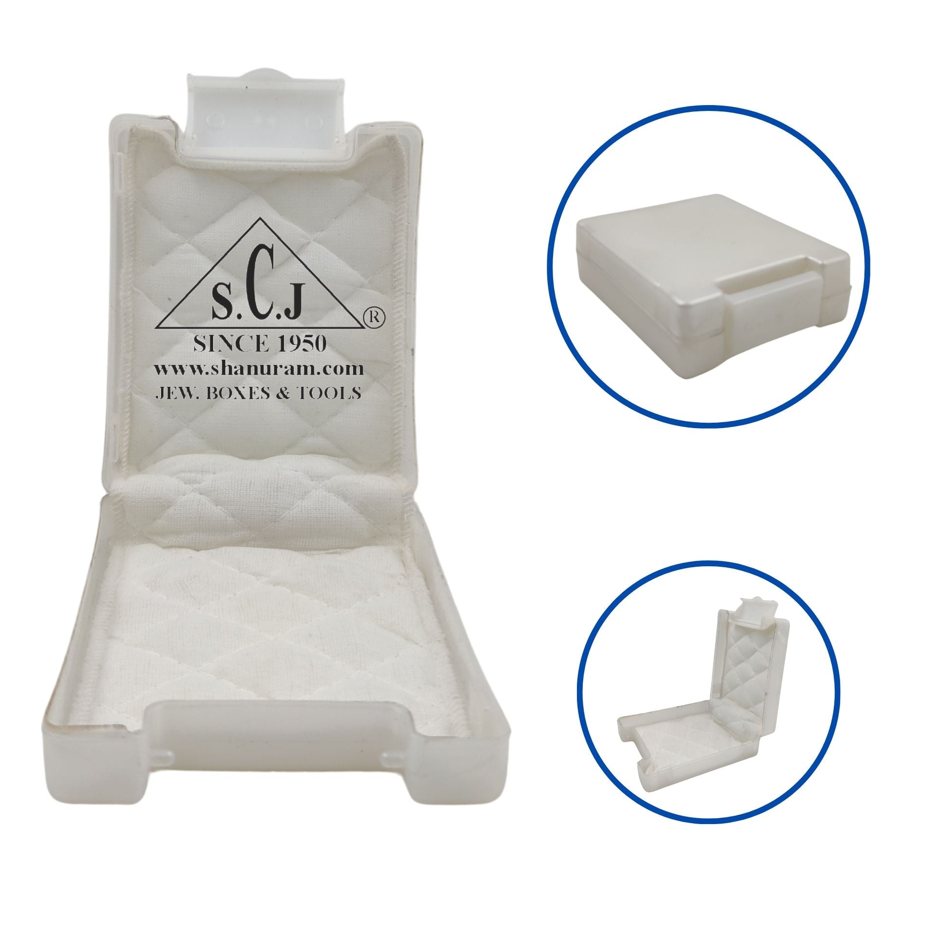 The SCJ Small Tops and Earrings Box is a refined jewelry storage box crafted from durable plastic in an off-white color. Inside, it features a luxurious white cloth lining that protects your small tops and earrings. The box includes secure clips to hold your jewelry in place, ensuring they stay organized and beautifully presented. With compact dimensions of 3.25 x 4 x 1, it’s perfect for storing and displaying your delicate earrings and small tops.