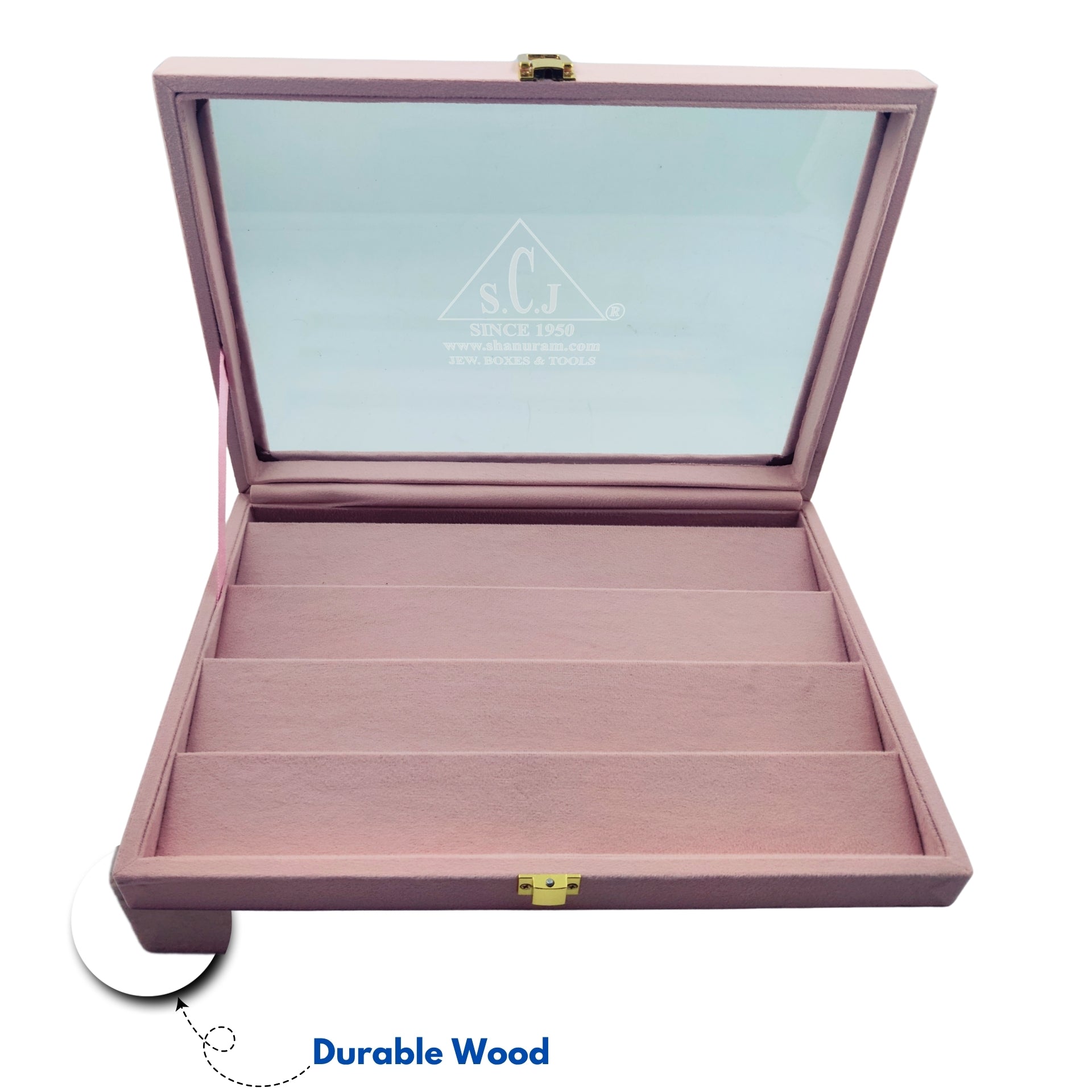 This elegant Pink Suede Tops & Ear-ring Jewellery Stock Display Box is crafted from high-quality wood, offering exceptional durability and a luxurious soft-touch feel. The glass top provides clear visibility, making it ideal for retail counters and personal jewellery organisation.